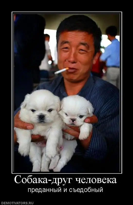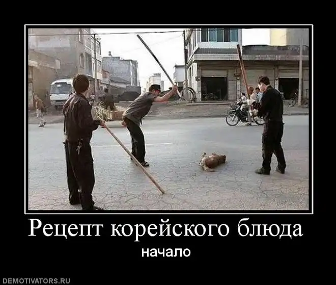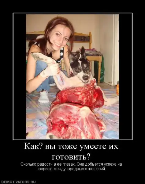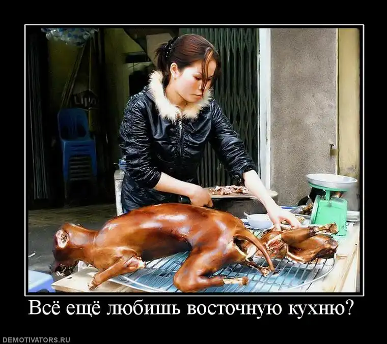 На деме где девушка улыбается рядом с разрезаным трупом собаки и машет ее лапой - она не готовит ее. Девушка учится на ветеринара, с подругой они подобрали на улице мертвого пса и препарировали его в образовательных целях фотографируя процесс. Как и все студенты "за работой" сделали пару веселых фото, и все возмутились вплоть до их отчисления.