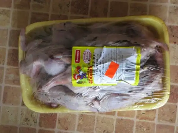 Девушка купила несколько тушек перепелок, пачку семечек и пакет с гусиным пухом.