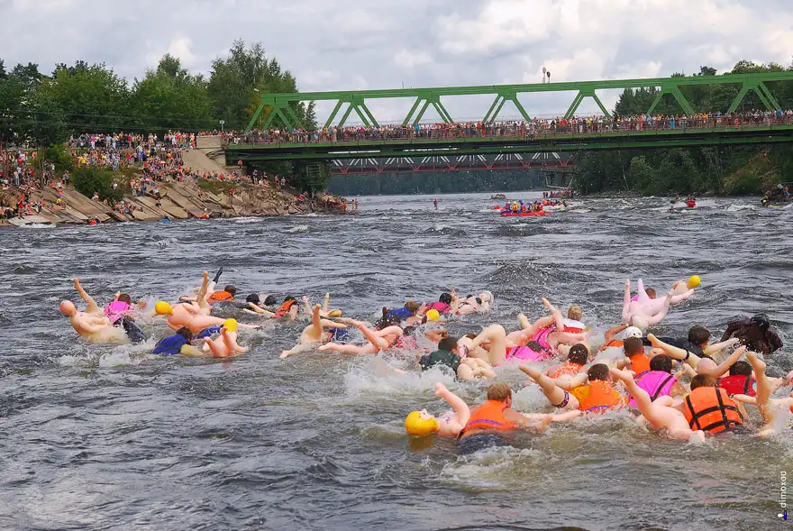 По команде организатора все бросились в бурные потоки Вуоксы.