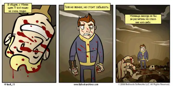 С убежищами в Fallout вобще отдельная тема. Я обожал лазить по ним в игре и узнавать их историю. Например в убежище 11 каждый год один человек должен был спуститься в комнату жертвоприношения, иначе система жизнеобеспечения отключится. Там такая интрига разыгралась(узнать можно почитывая данные на терминалах в убежище). В конце концов осталось пять человек и они отказались выполнять условия, система оповестила, что они поступили правильно, и эксперимент завершен, и выпустила их. но они все застрелились
