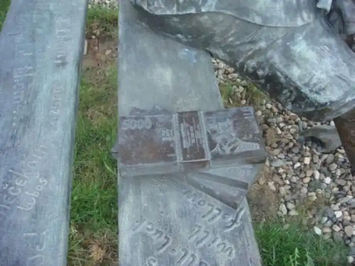 На лавочке сидит мужчина с лотерейным билетом и еженедельником "Сазки" в руке (в 2001 году был небольшой шум из-за того, что мужчина напоминал Вацлава Гавела в юности, но скандала не случилось и все затихло).