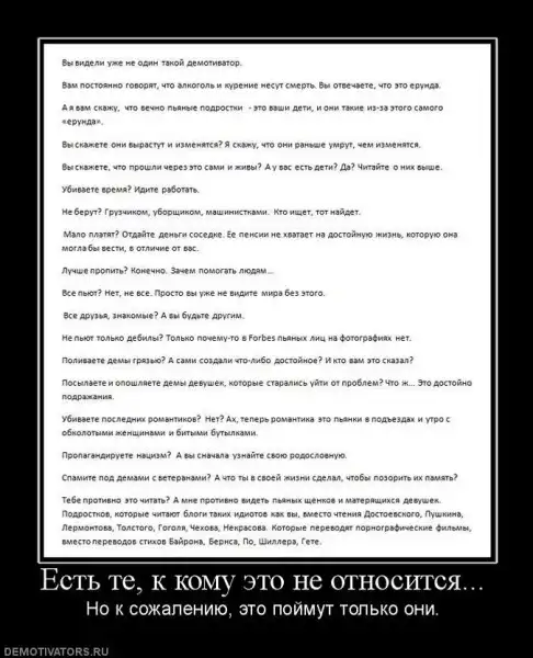 Бля... Как достала эта хрень на тему: "Всё херово", "Кругом дерьмо", "Власть дерьмо", "Народ бедный и пьяный", "А ты видишь разницу?". Забебало!!!! Если вы видите только это - жаль вас, неудачники! Но как говорится: "скажи человеку 100 раз, что он свинья и он захрюкает".