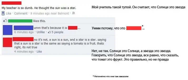 Замазано имя утверждающего, что Солнце - не звезда, к которому и обращается ответивший. В переводе фраза ответившего звучит как "Да потому что так оно и есть, Вася". "Переводчик" картинки опозорился.