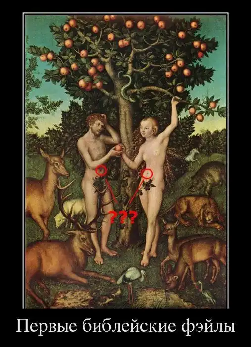 На тему Адама и Евы. Это художник изобразил их с пупками,но полотно то,всяко было написано позже библии))) И не в самой книге он это взял,так что фэйл не библейский))