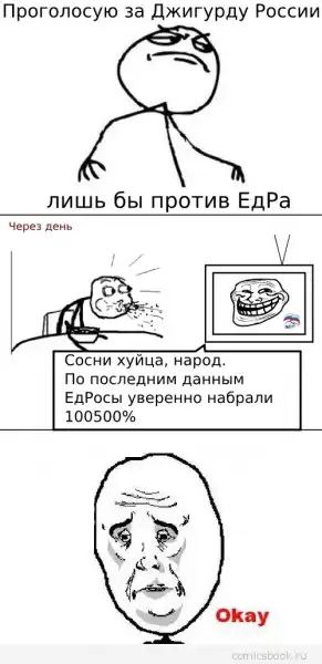 они страну кошмарят с десяток лет а вы про какие то выборы бунты и т.д. 5го числа всем скажут победила партия жулдиков и воров сосите х*й дальше! а мы все дружно сделаем воттак