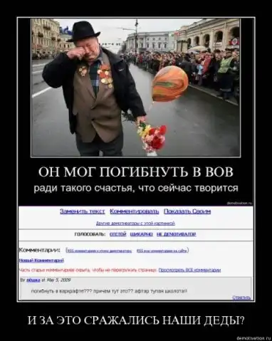 Товарищи, не будьте быдлом!!! Автор хоть и молод, но уже сейчас понимает суть проблемы глубже вас грибов-старпёров! Суть демов не в том чтобы подписать картинку повыёбистее, а донести до людей свои мысли и умозаключения, тем самым, хоть чуит-чуть, но осободить Вас же от Ваших же говноразмышлений и говномнимого патриотизма! Весь Русский патриотизм умерает вместе с героями войны! И к сожалению этих героев, кто хочет защищать свою Родину и свою Мать становится с каждой минутой всё меньше и меньше! Пейте ягу, жрите наркоту и через 50 лет Африка станет более развитой и социально обеспеченной страной нежели Россия!