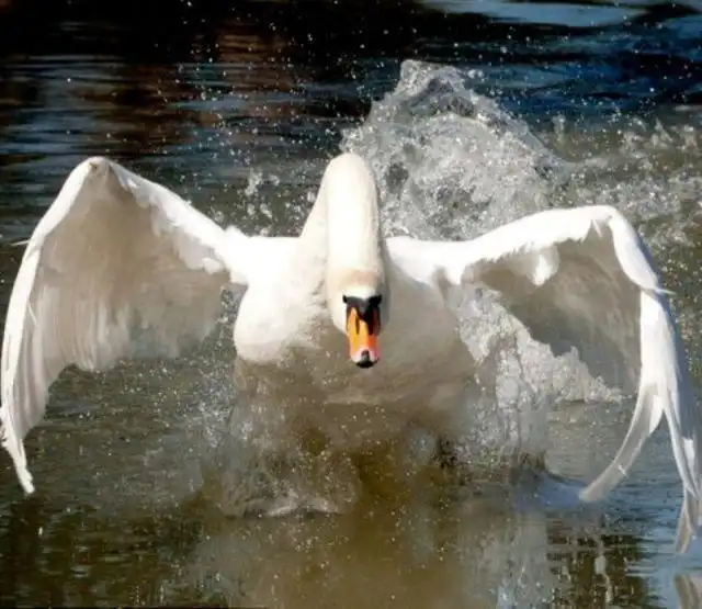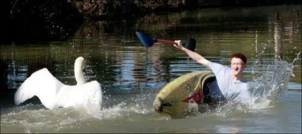 гусь победил ))) у него там наверное маленькие лебедятки недалеко )