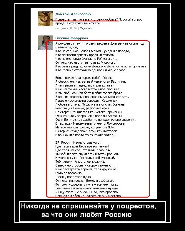пост вроди и ничего смотрится, но наличие слова поцреот вымораживает... у нас что патритом быть зазорно????!!! или срать на родину теперь в моду вошло удолбанных мажоров, и безголовых школьников???!!!! извините за резкость, накипело.