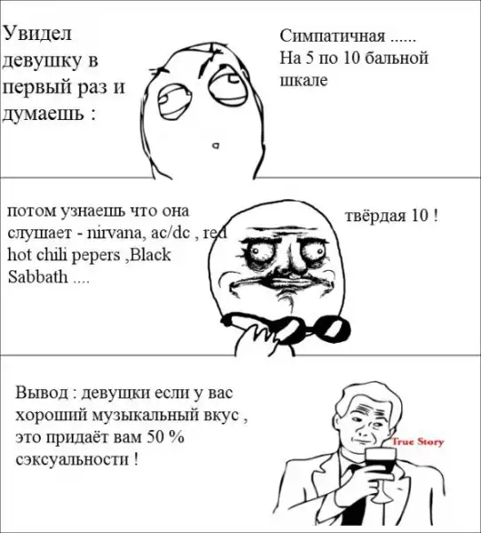 сейчас меня прикалывает клубняк от рэпа нормального не воротит линкин парк могу послушать некоторые под рок в качалке нормально... но всёже меня напрягает тот факт что идолом молодёжи после этих комиксов будут размалёваные волосатые олени реальные наркоманы и депресняки(луче репчик и планчик чем металл и героин) между умом и здоровьем луче выбрать здоровье... к томуже есть такиие придурки но в жизни поимели столько умные аж стояли с открытыми ртами (вывод в жизни глвное не ум а приспосабливаемость и коммуникабельность в обществе)