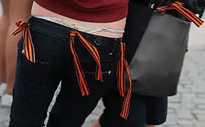 Как пишут сами устроители данного мероприятия: В дни проведения акции, а особенно — в день празднования дня Победы, каждый участвующий и помнящий о празднике прикрепляет Георгиевские ленты к своей одежде (на воротник либо лацкан одежды) либо на сумку, антенну автомобиля, обвязывает лентой руку, вплетает ее в волосы и прочее(???). Существует множество вариантов того, как наиболее эффективно и гармонично закрепить Георгиевскую ленточку — незаменимый элемент торжественного дня.