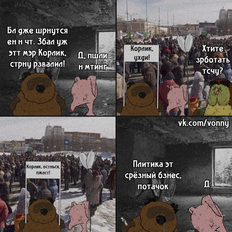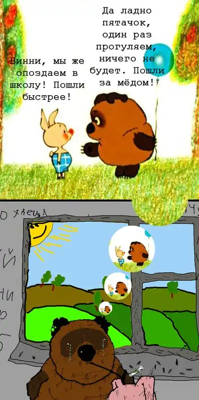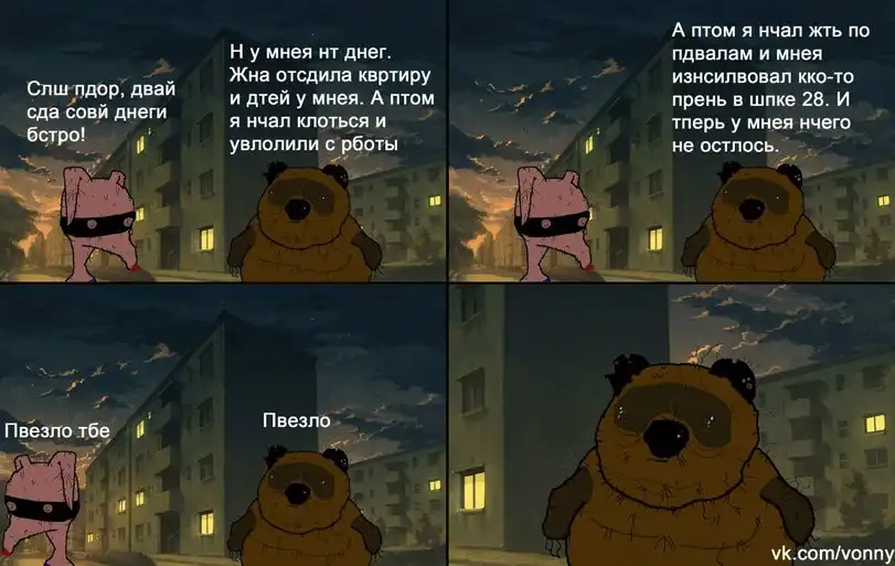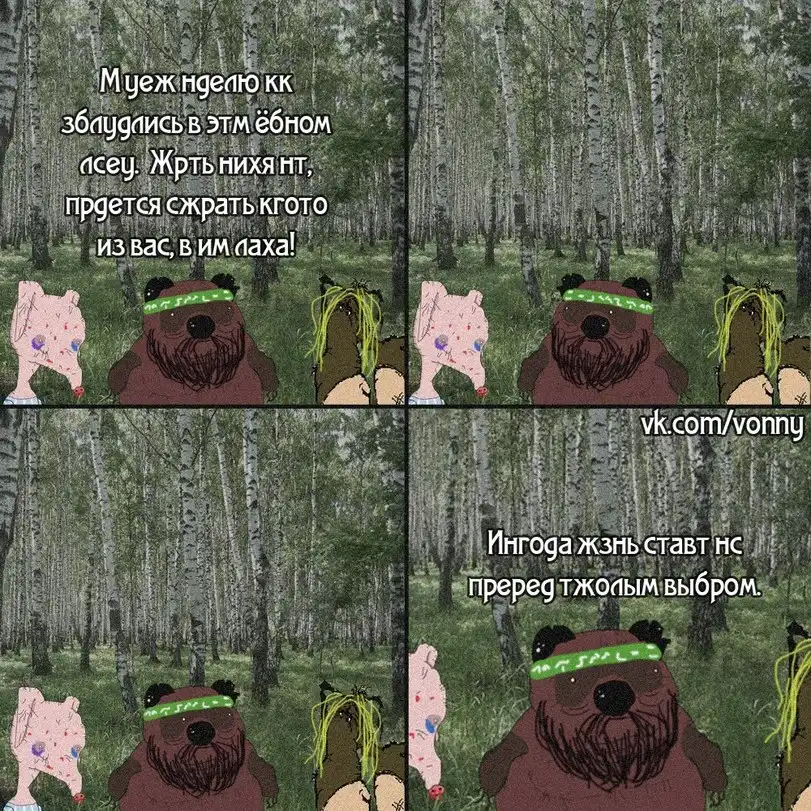«Вонни и его друзья» — чернушно-депрессушный веб-комикс. В нем живут и действуют альтернативные персонажи добрых детских сказок — Винни Пух (Вонни), Пятачок (Потачок), Аи (Иа), Своа (Сова) и пр. Поглощенные и подавленные социальными проблемами, наркоманией и насилием, герои движутся сквозь мрачные декорации и говорят на странном, но вполне понятном языке, напоминающем речь алкоголика.