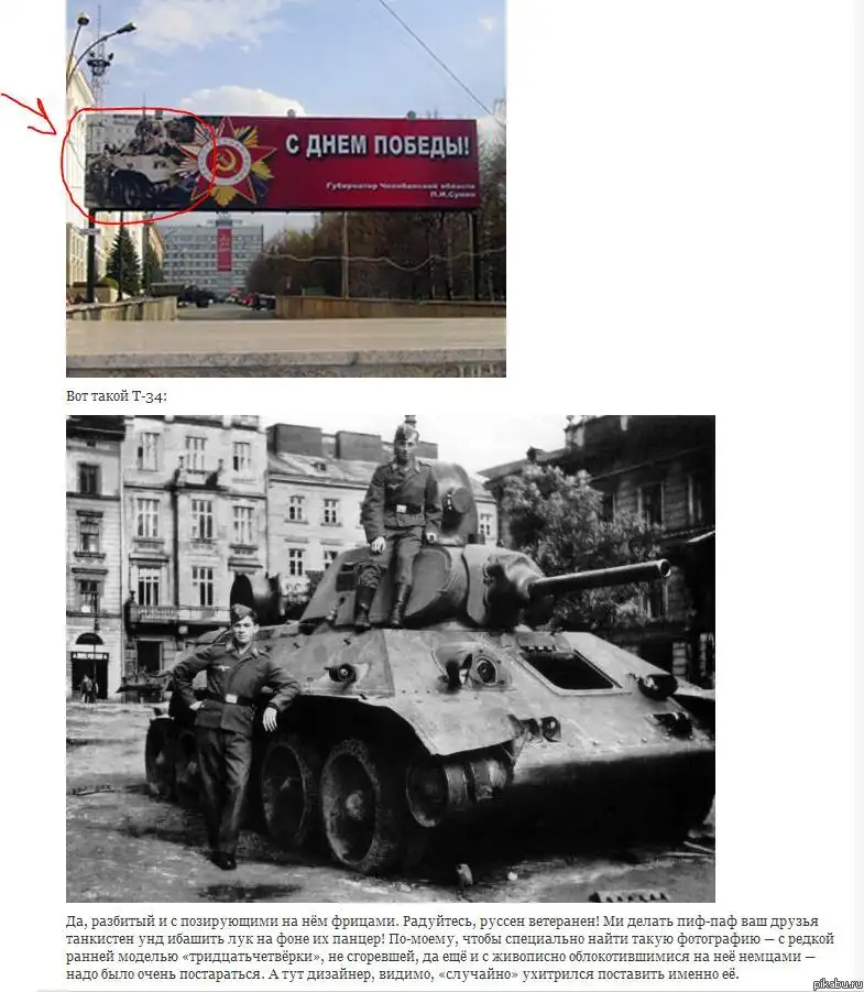 Не минусну Но в картинке про Т-34 разные дома на заднем плане. Просто какие-то товарищи, которые нам совсем не товарищи, пытаются, не овладев в совершенстве фотошопом, обоср*ть участников ВОВ - то есть чьих то бабушек и дедушек.