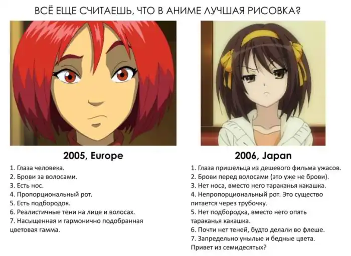 хотелось бы сказать про анимэ рисовку и европейскую рисовку. так вот, сравните уровень анимации, взяв не ширпотребный мыльный апимэ сериал, а, например, фильм вроде акиры или евангелиона. вот где европа пососет глубоко и с причмокиванием. ато выпендрились - сравнили особенности рисовки лица и все.