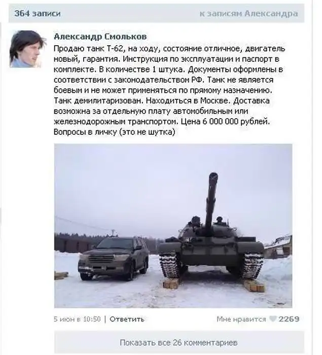Кстати, я вот всё думал, где же мне себе танк купить, чтобы в магазин за хлебом ездить, а тут вот как удачно в пост зашел.