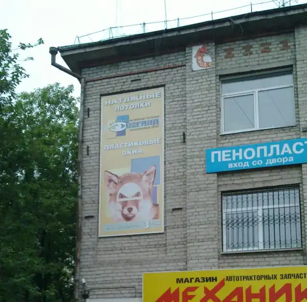 В чем связь между лисой и пластиковыми окнами?!! Больше всего вызывает интерес какая-то 180-градусная хреновина на носу у лисы и с вырезами для глаз. :facepalm: