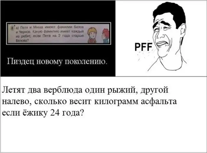 Про ту картинку, с детской задачей. Авторы хотели, что-бы ребенок выстроил логическую цепочку, вроде "Петя старше Белова => Петя не носит фамилию Белов => Петя Чернов и Миша Белов". Такие задачи гораздо полезней для развития, чем тупое задрачивание таблицы умножения.