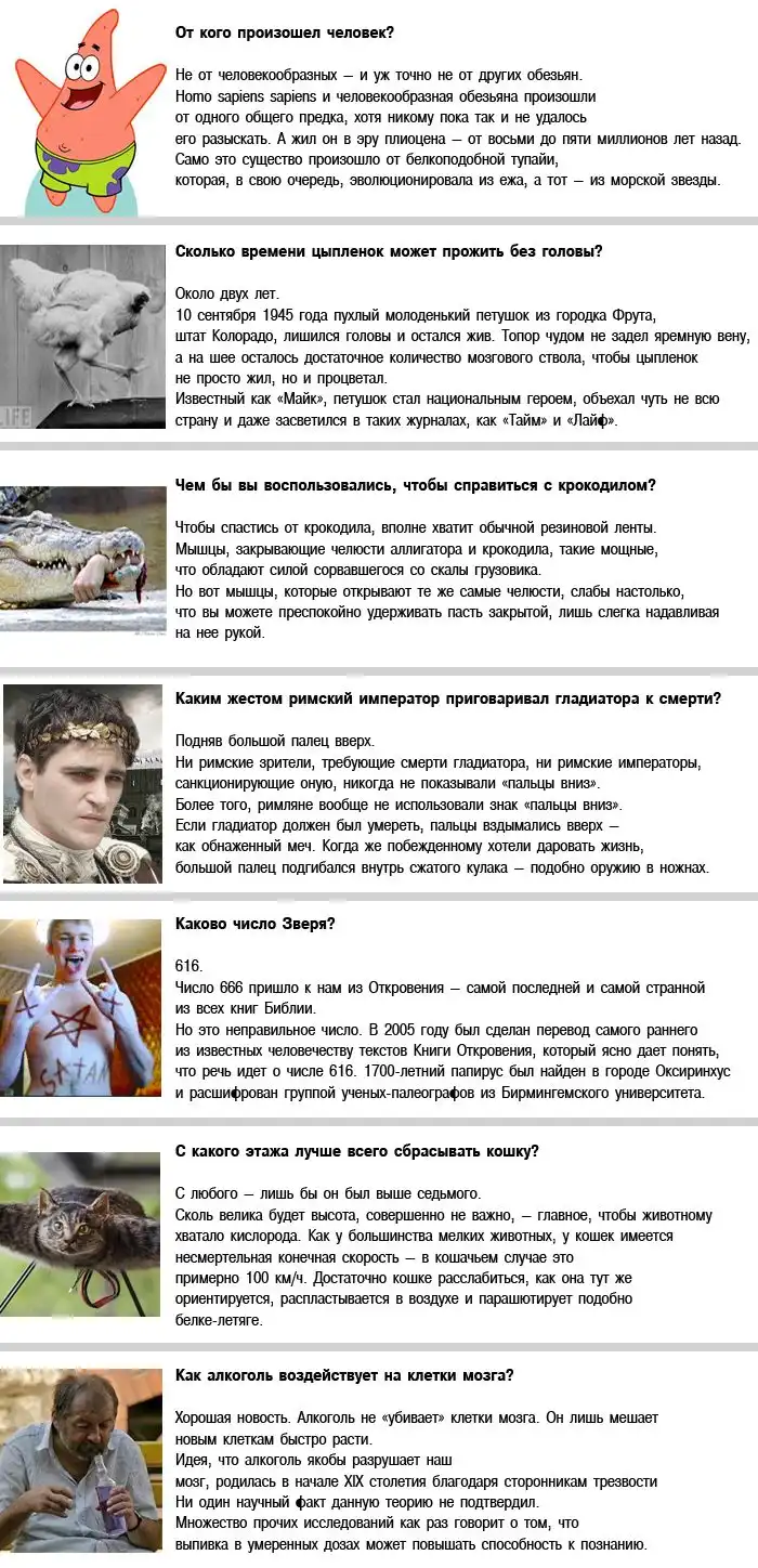 Не факты а самый настоящий троллинг. Взять хотя бы цепленка который 2 года без головы прожил, а питался он через что извените за вопрос? А без еды 2 годы курица не протянет. (хОТЯ ПРО КРОКОДИЛА ЗНАЮ ЧТО ПРАВДА...)