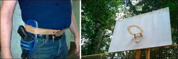 Рецепты по "улучшению жизни" из американской глубинки. Слева: кобура для шерифа трейлерного парка белой швали. Справа: туалетный баскетбол.