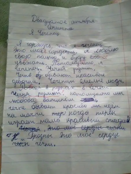 Блин, уже не первый раз вижу сочинение малолетнего нохчи, но насколько же оно хорошо отражает общий образ мысли младого поколения нохчей:) В идеале сочинение ещё должно быть написано в московской школе:)