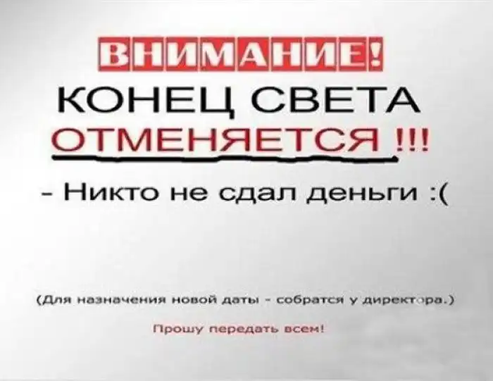 Большая порция приколов по поводу конца света. Даже если Вы и верите в приход апокалипсиса, я не советую Вам делать необдуманные глупости, о которых потом обязательно придется пожалеть ;)Не без баянов :)