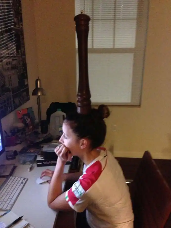 Надоело скучать в одиночестве в то время, когда ваши близкие пялятся в экран монитора? Один американец придумал необычный способ развлечься. Когда жена погружается с головой в виртуальное пространство, он ставит на её голову разнообразные предметы. Увлеченная супруга не сразу замечает, что сверху прибавилось тяжести (ну или хорошо подыгрывает). Этого времени хватает для того, чтобы сделать кадр. Очень странная всё-таки семейка!
