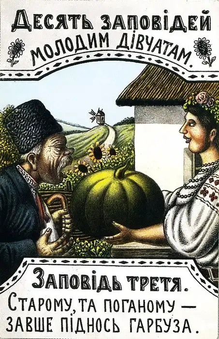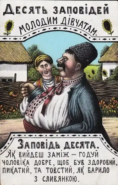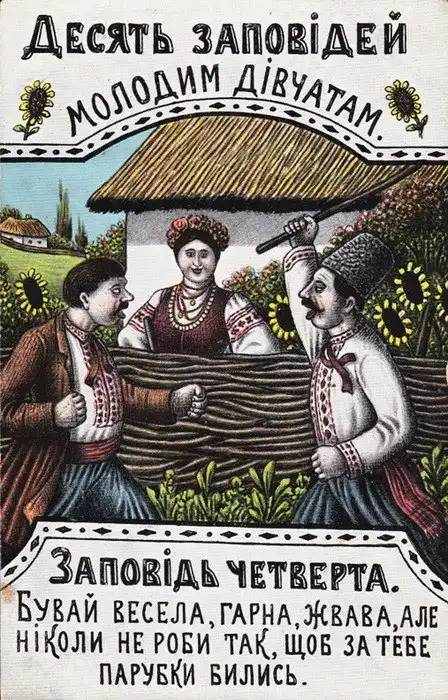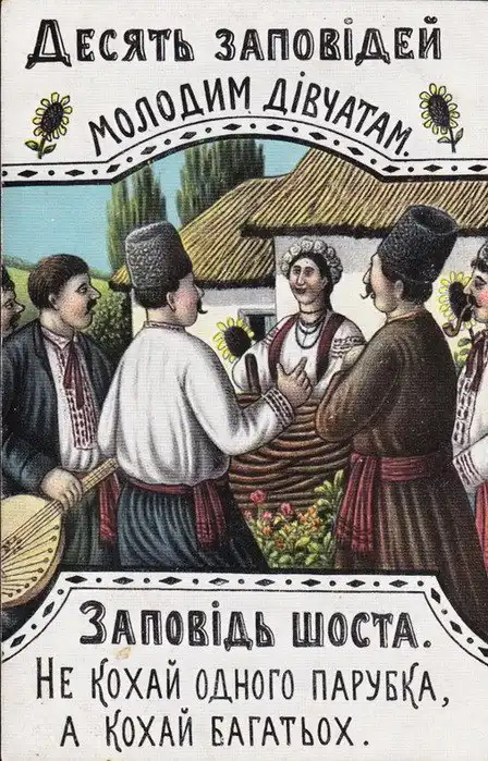 В одной из серий открыток 1918 года было 10 заповедей молодым украинкам. До нашего времени дошли только 8 из 10.