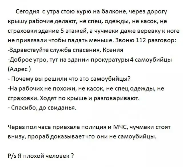 Если бы это оказались самоубийцы , то лучше приехал катафалк сразу !