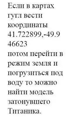 открываешь гуглакарты , справа выбираешь "Земля", устанавливаешь плагин, в поисковой строке набираешь "41.722899, -49.946623", и увеличивай. недалеко от значка (справа) увидишь макеты-половинки Титаника.