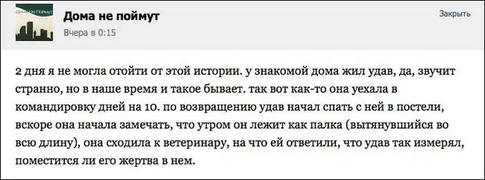 Про удава. Напомнило историю про варана, который цапнул хозяина и ходил за ним, в итоге оказалось, что он впрыснул яд, который убил бы бедолагу. Но не получилось! )