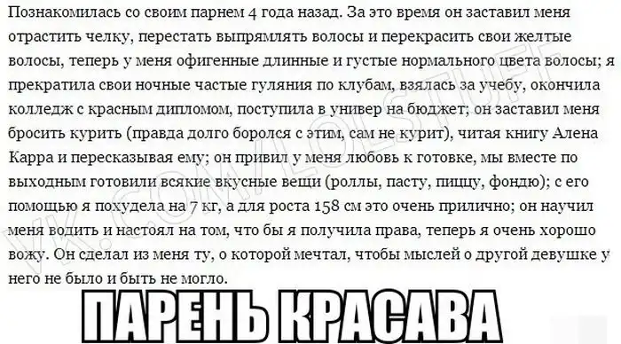 , тут не парень красава, а сама девушка захотела измениться, а он ее поддержал. Ну и помог. Уж если баба весь день жрет, чо не приколочено, а вечером пивка 4 полторахи, то никакой парень ей не поможет!