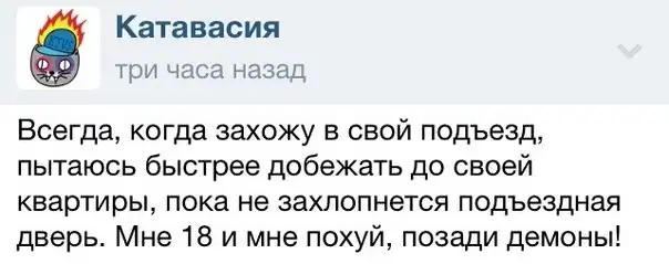 Ахах,мне 26 и я,зайдя в подъезд,пытаюсь пробежать первые два лестничных проема пока не захлопнулась дверь,но не из-за демонов,просто с каждым разом пытаюсь подняться все выше!:-)