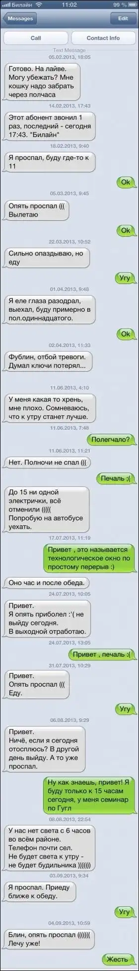 Длинная переписка про опоздания - очень похожа на мою переписку с начальницей))