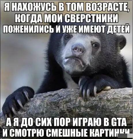Мои сверстники уже развестись успели. И даже по два раза. А некоторые даже уже умерли, бл..ать... А я до сих пор играю в машинки, в девчонки, в стрелялки и в спортзалки... Жись не удалась!