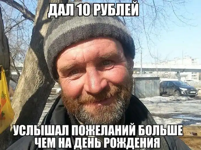 а вы представьте когда я дал бомжу 100 рублей... он дар речи потерял на какое то время и все переводил взгляд с меня и на бумажку. я не знаю, пропил он их или реально купил поесть, но глаза его светились счастьем... делайте добро люди, возможно оно вернется