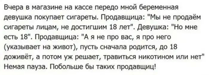 А если, к примеру, беременная девушка мужу сигареты покупала?....