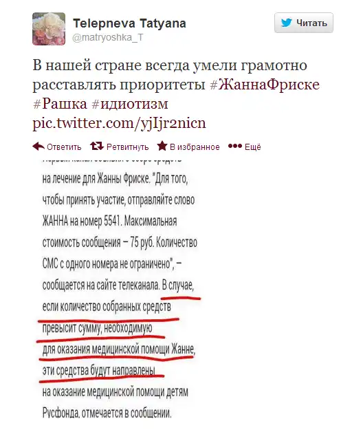 Млять Малахов в своей программе устроил сборы, она его знакомая, видимо посчитал нужным. Первый канал проводит периодически сбор денег детям с помощью смс также. Разные известные личности, типо Чулпан Хаматовой с соратниками собирают деньги и проводят мероприятия для больных детей, я уж не говорю про сайты, через которые вы без особых проблем, не отдирая жопу от дивана можете помочь рублем детям, перечислив их удобным для Вас способом. Просто кто то сидит и смердит своей зловонной желчью, не готовый помочь ни мадам фриски, ни больным детям, зато балаболить в интернете мол за что?! за чем!? да какая тебе нахyй разница?:! тебя лично никто не заставляет отдавать ни фриски , ни детям, балаболы теоретики просто сама справедливость в распоряжении чужими деньгами..