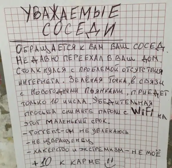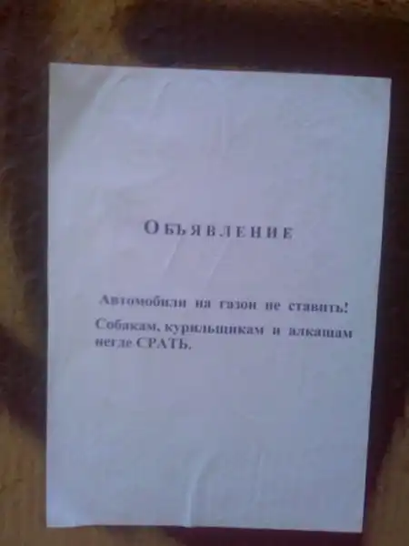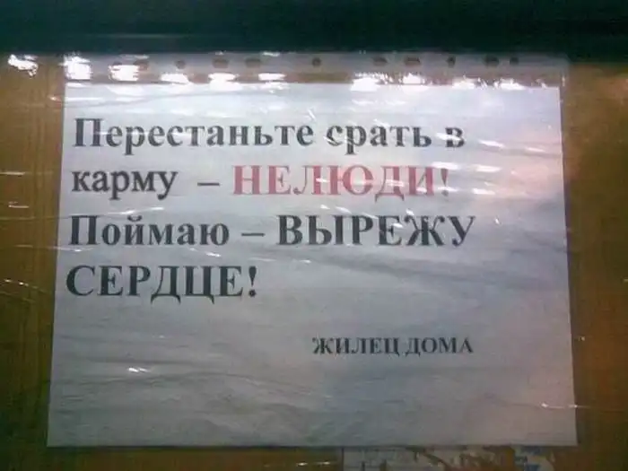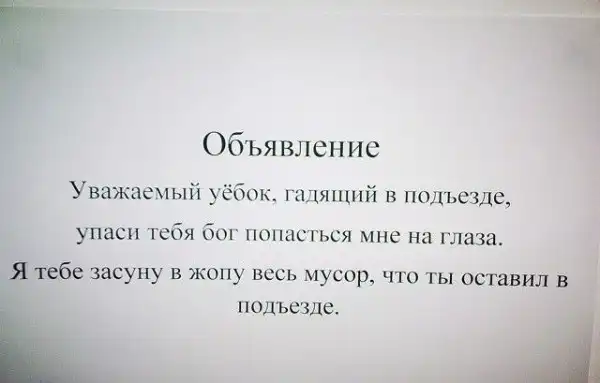 Несмотря на это, с соседями приходится обсуждать какие-то совместные жилищные вопросы, мешающие жить другим людям, либо посредством личного общения, либо через объявления, некоторые из которых и представлены вашему вниманию. Внимание:Присутствует ненормативная лексика!!