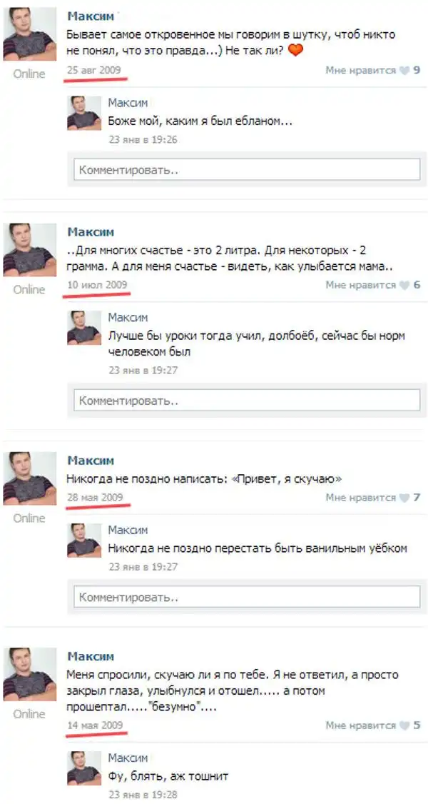 То Максим - познакомился с телкой , всю ночь пыжились, час поспал и поехал на работу , в обед от нее приходит смс - мася..я так уже соскучилась...целую в носик... , и через минуту другая - держись чувак ! потерпи до вечера ! затрахаю до одурения ! - пока думал что бы это значило , приходит третья - выбери сам ,какой мне быть для тебя лучше ? ))))))))