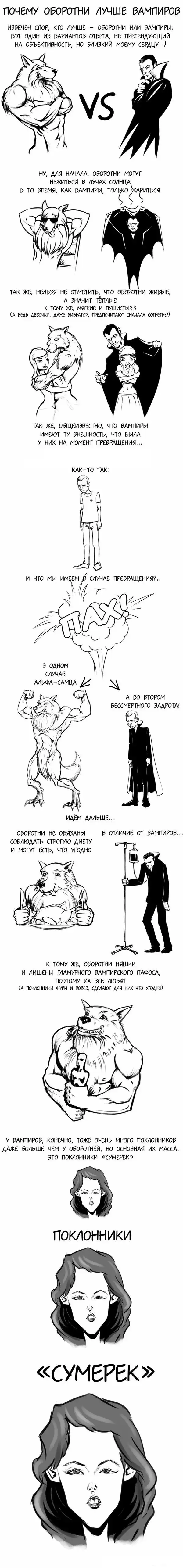 Не соглашусь с выводами сравнения оборотней и вампиров! Как раз таки любители оборотней и есть поклонники Сумерек! Это там их сделали теплыми "плюшевыми мишками". В остальных же произведениях это тупые, безвольные существа.