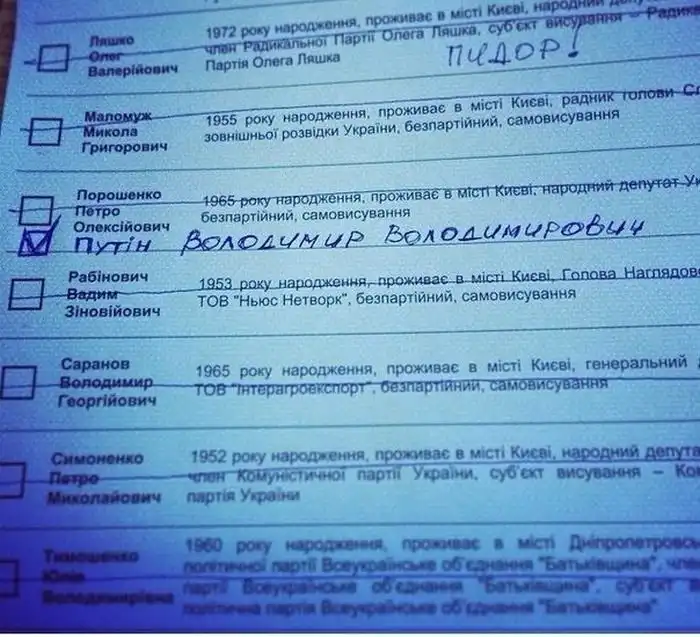 После того, как на Украине прошли внеочередные выборы президента, в сети стали появляться снимки испорченных бюллетеней, на которых люди решили высказать свое мнение или же предложить своего кандидата, вместо того, чтобы отдать свой голос.