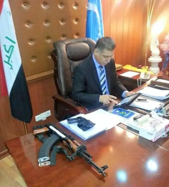 У мужика в кабинете на столе лежит АКМС (автомат Калашникова модернизированный со складным прикладом 7.62х39) и к нему подсоединен магазин от РПК (ручной пулемет Калашникова) на 45 патронов.