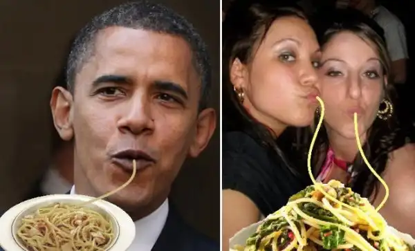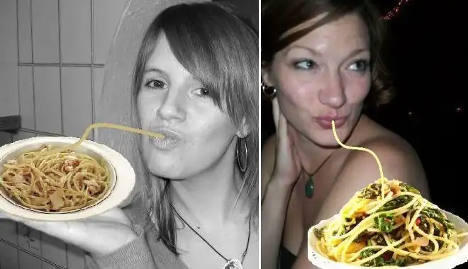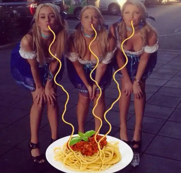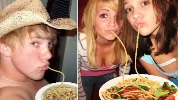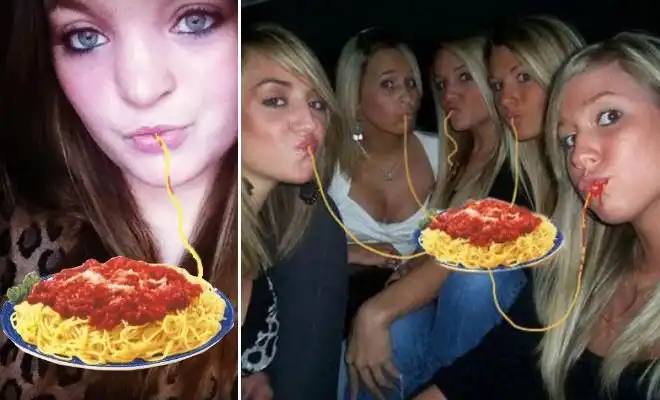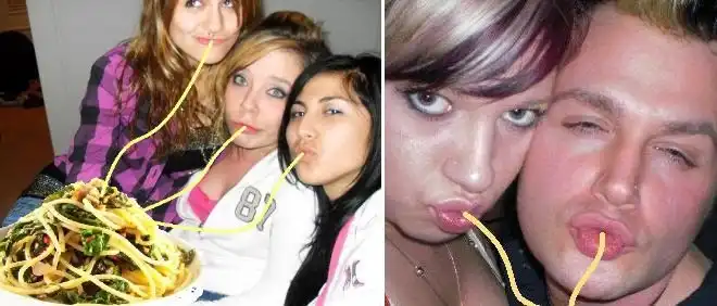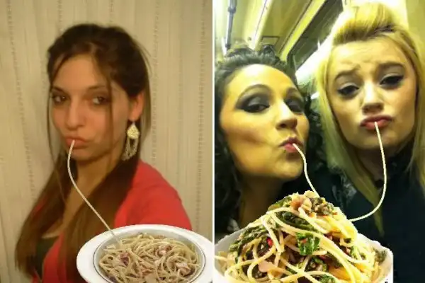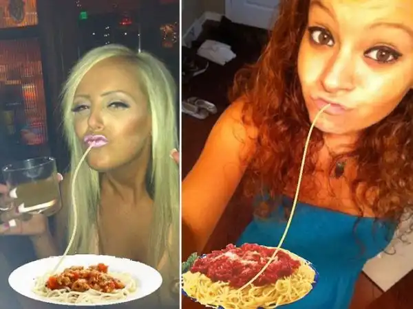 Как не издевался интернет над любителями крутить дакфейс во время фотосъемки, никто так и не кается. Один из самых веселых методов наказания уточек - это спагетти. Увидел свернутые трубочкой губки - добавь вермишели. Получается очень органично.