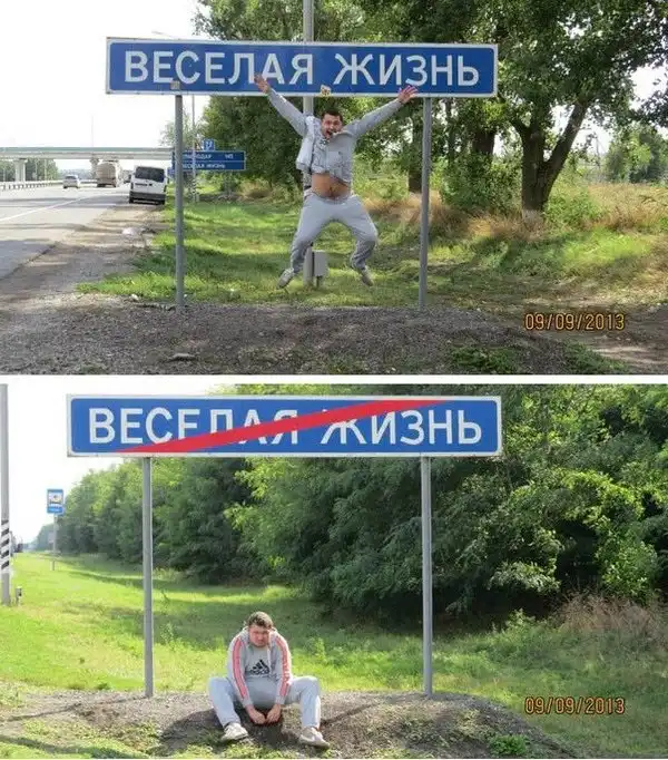 многие авторы ставят в свои подборки фотку со знаком "веселая жизнь".это станица под Краснодаром.но мало кто знает что как раз напротив этого знака,справа,находится КЛАДБИЩЕ!!! а сама станица в километре от трассы.и когда проезжаешь мимо-жизнь становится "веселее".