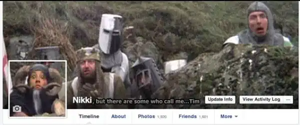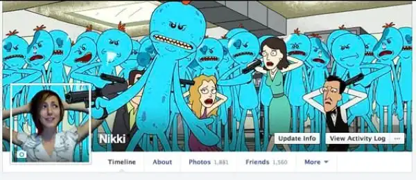 К оформлению своей страницы на Facebook можно подойти творчески и связать обложку с персональной фотографией в одном сюжете. Девушка по имени Никки регулярно прокачивает свою страницу и мастерит на ней ржачные киноколлажи.