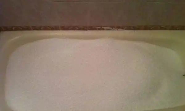 Почему–то я не учел того факта, что плотность пенопласта сильно ниже плотности воды. То есть он не тонет. Он всплывает. То есть обмакнуть его в воду не получится. Я это понял только тогда, когда гора пенопласта поднялась над поверхностью ванны на 20 см. и грозилась ссыпаться с краев. Вся вода, которую я налил, была внизу, а над ней был слой в полметра пенопласта. Нужно было заставить пенопласт тонуть. Я попробовал топить его руками и промывать в нижнем слое воды, но ариэль был для машинной стирки и жутко щипался. Руки для утопления пенопласта не подходили.