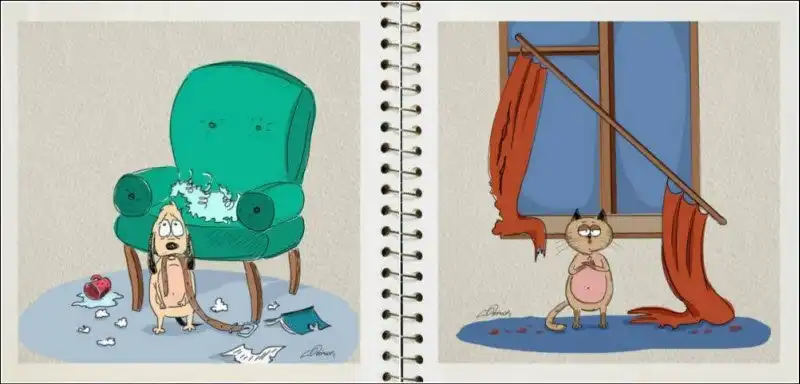 И пёс есть и кот,встречают оба всех членов семьи,пёс,конечно,энергично вибрируя всем телом)),а кот как китайский император,величественно-вальяжно,и спит кот в кошкодоме,а пёс с детьми на кровати,сложив все конечности на дочь,при этом громко хрюкая.Мебель ни тот,ни другой,даже в щенячье-котёночном прошлом,не портили.Воспитывать надо своих питомцев,и тогда у Вас будет только море позитива от общения с ними.