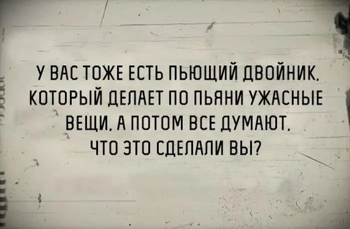 У меня нету пьющего двойника, у меня есть трезвый двойник - скучный и занудный!