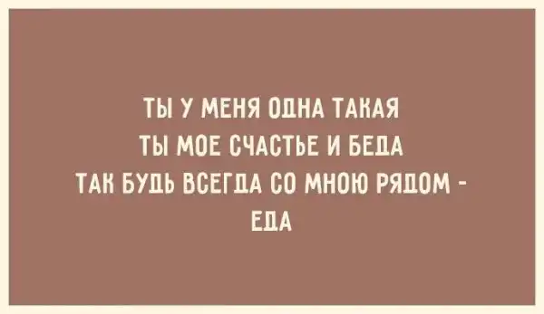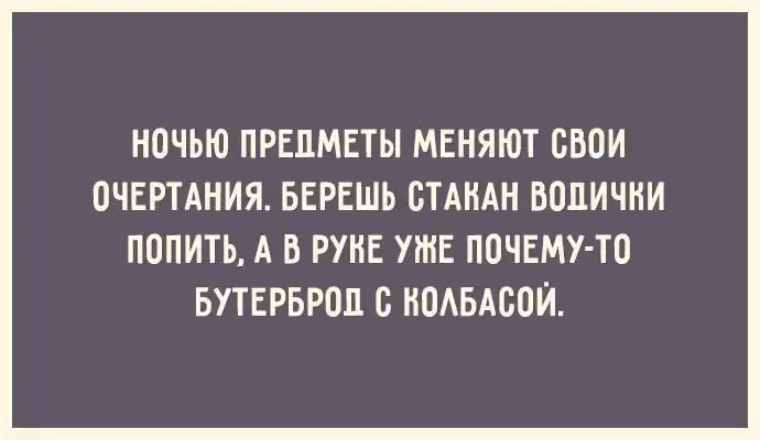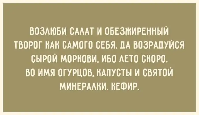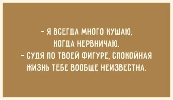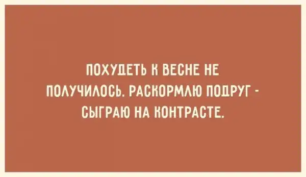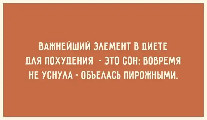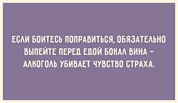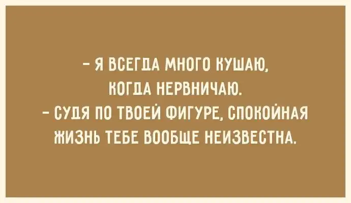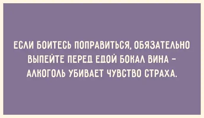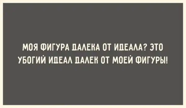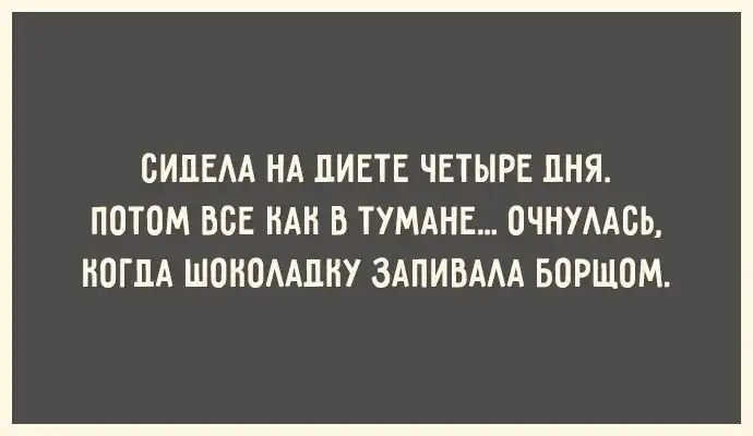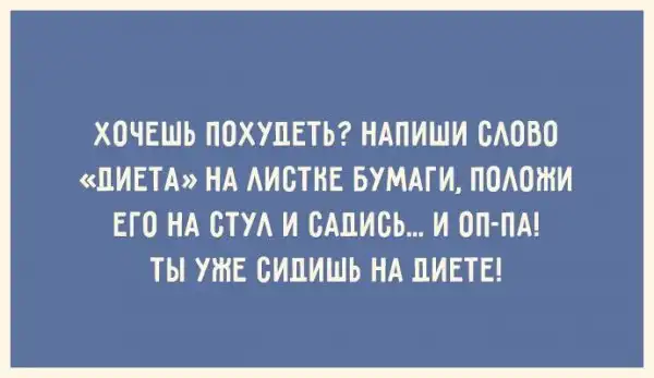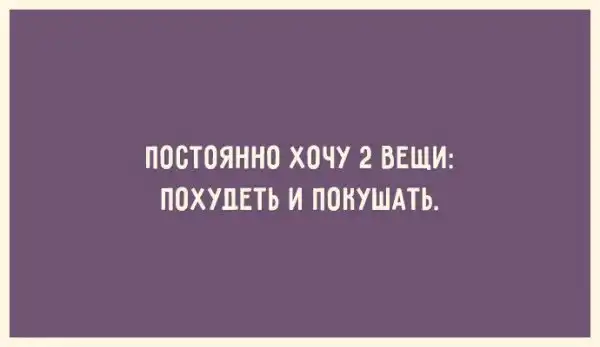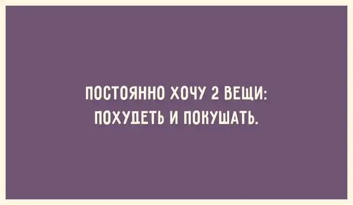 Этот юмор будет понятен каждому, кто хоть раз интересовался такими понятиями как «диета», «правильное питание» или «похудение». Не стоит забывать, что хорошее настроение и смех – важнейшие составляющие красивой фигуры.