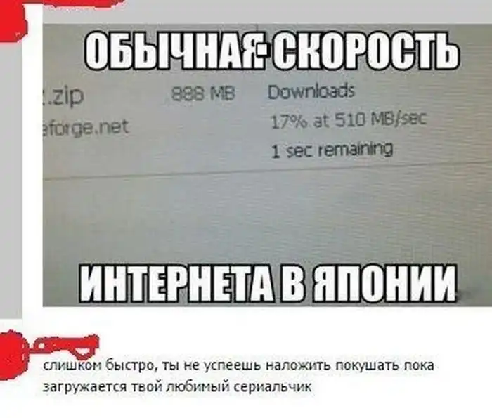 В Жапоне 510 мегабит/сек. Мне тока обещают оптоволокно и 3 мегабита
