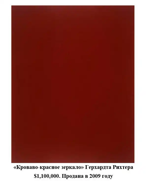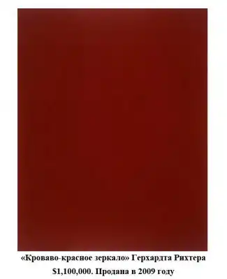 В«ЗеркалоВ» было продано за 1,1 миллиона. Осознавая ценность остальных работ Герхарда Рихтера, трудно понять ценность этой. Это же всего лишь красная краска, нанесённая с небольшим градиентом на зеркало, так ведь? Возможно, коллекционеру, который это купил это произведение, просто хотелось видеть себя в зеркале в нестандартном цвете.